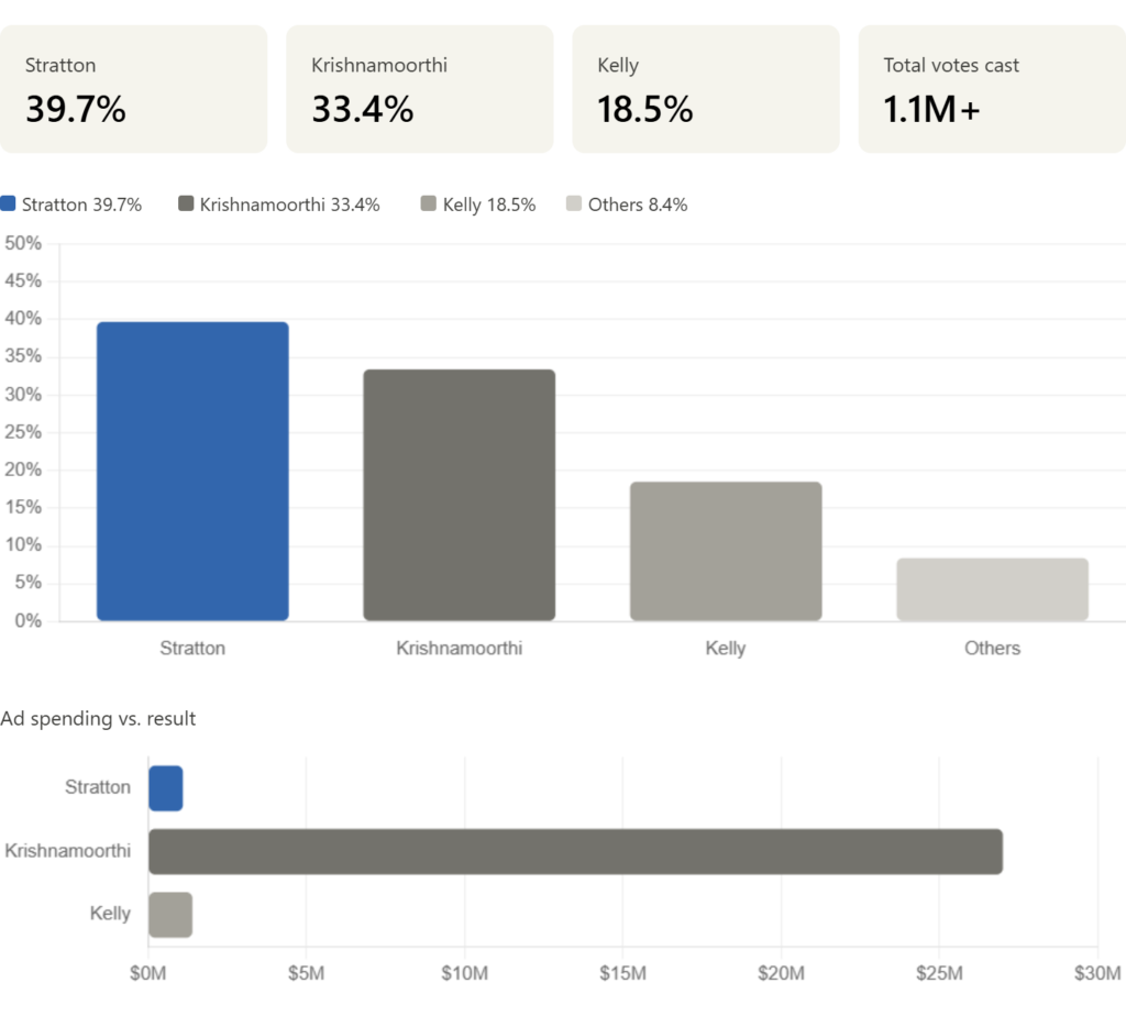 Stratton spent just $1.1 million on ads compared to Krishnamoorthi’s $27 million, but was carried by Gov. JB Pritzker’s Illinois Future PAC, which spent $14.9 million on her behalf. She defeated Krishnamoorthi by 20 points in the city of Chicago and the two were tied in the suburbs. Her message, including a viral ad featuring voters saying “f*** Trump” and a pledge to abolish ICE entirely, drew a sharp contrast with her rivals’ more moderate positioning. She outperformed Krishnamoorthi in the Metro East region, Sangamon County, Chicago and parts of Cook County, stripping away areas where he had expected to lead. (Chicago Sun-Times, NBC News)