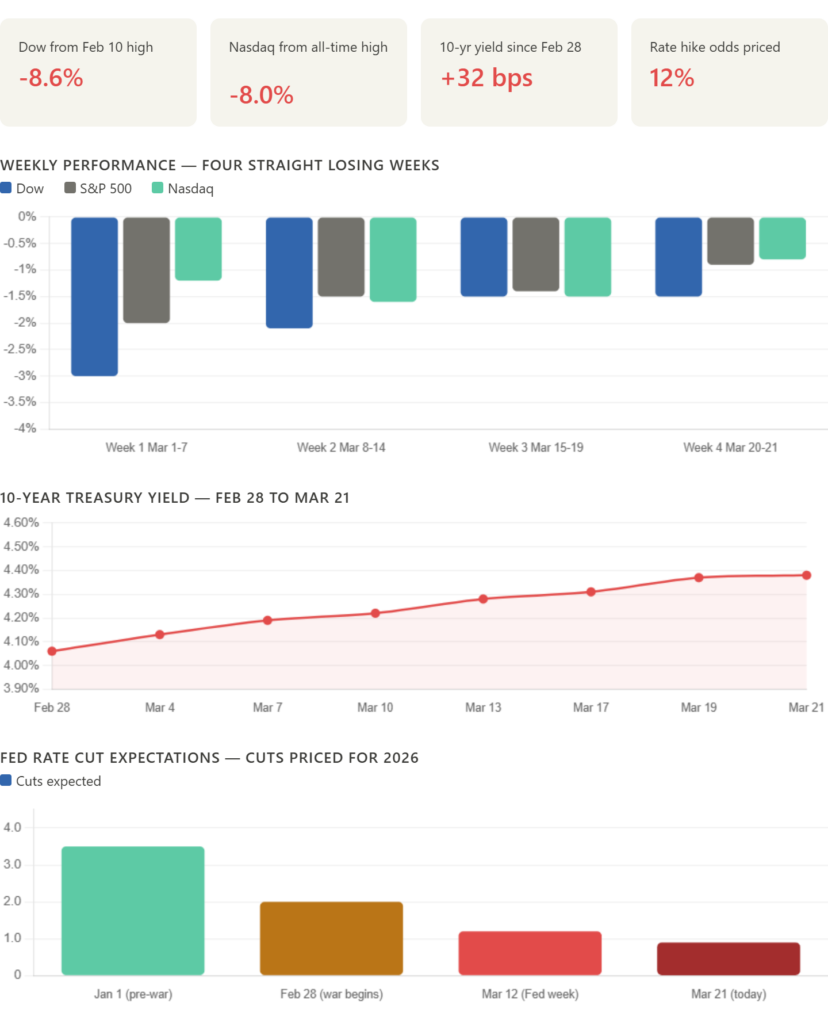 Four consecutive losing weeks. The S&P 500 below its 200-day moving average for the first time in ten months. Treasury yields up 42 basis points in a month. Rate cuts priced out for the year. These are not abstract market statistics. They are the financial system’s live assessment of where the economy is heading.